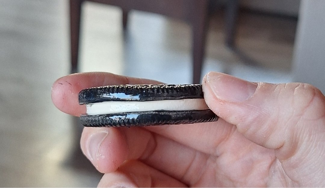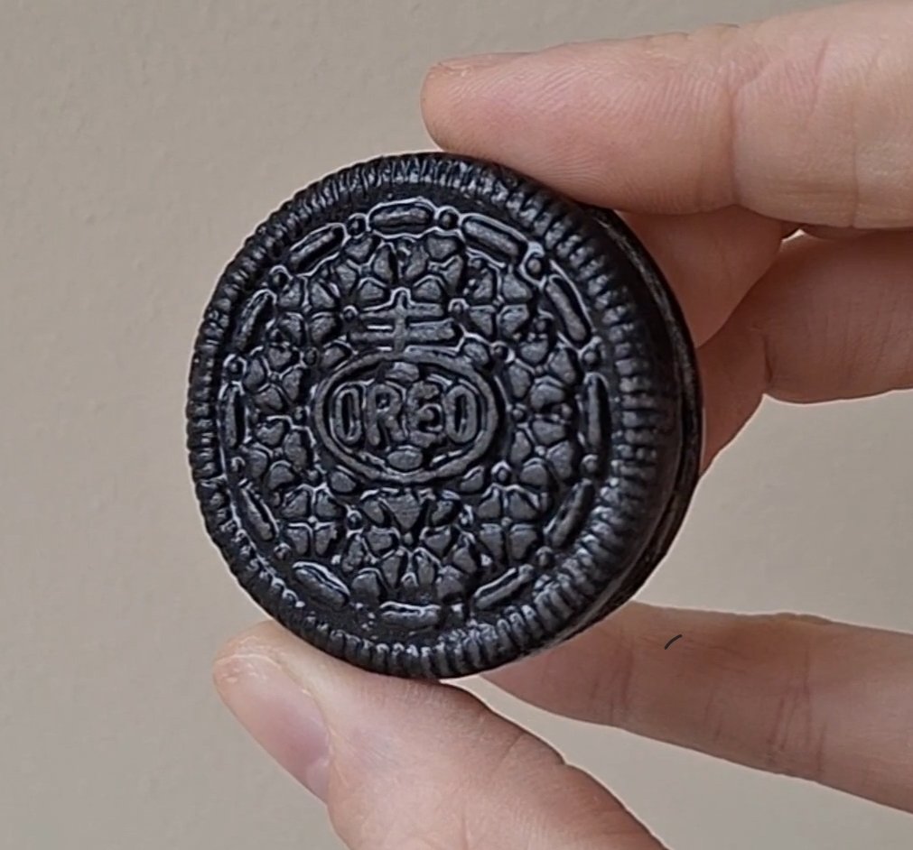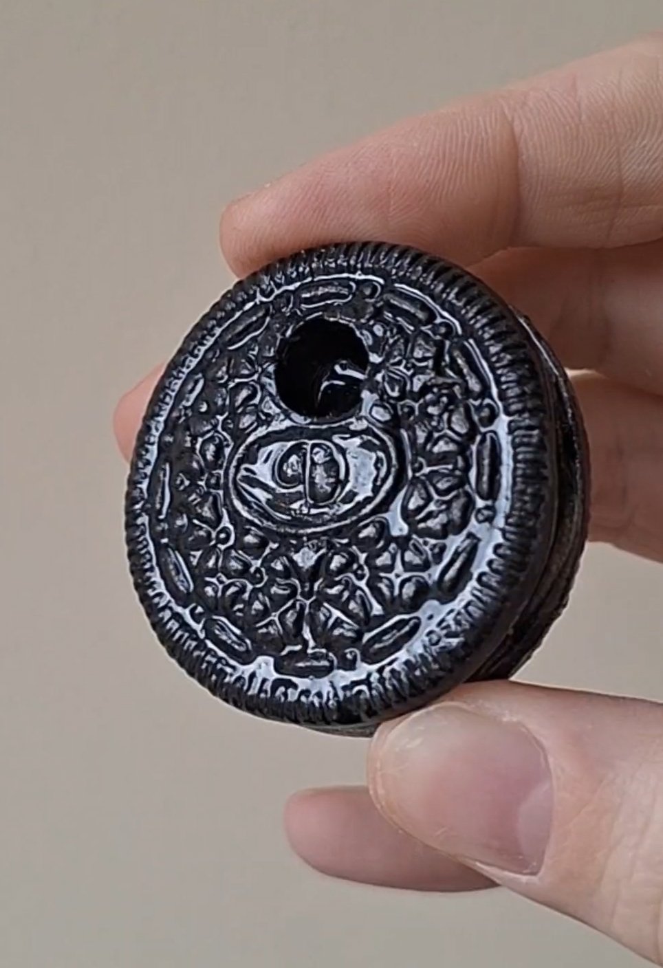 Oreo koekje van keramiek. Deze oreo is handgemaakt en geglazuurd en kan aan de muur gehangen worden. Komt in een mooi cadeauzakje.